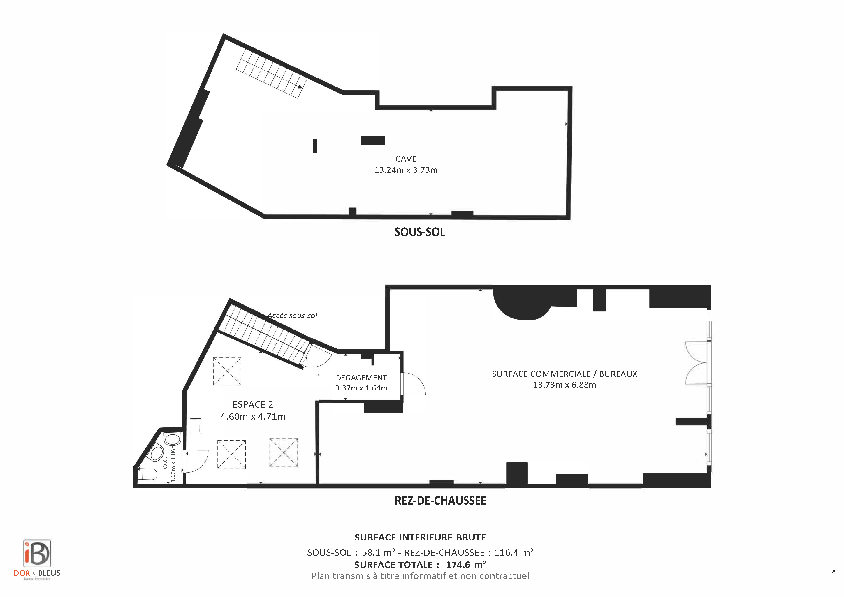 Rez-de-chaussée : surface commerciale/bureaux (+/-95 m²), dégagement (+/-6 m²) donnant accès à 1 pièce avec meuble évier (+/-22 m²), 1 w.c. avec lavabo (+/-3 m²).